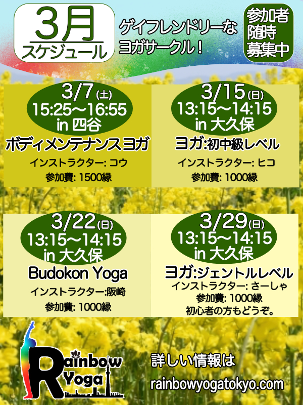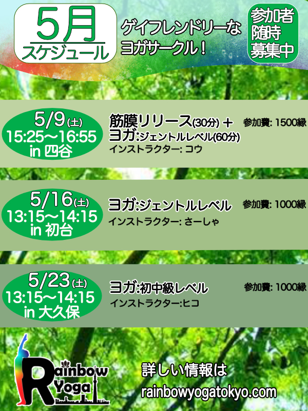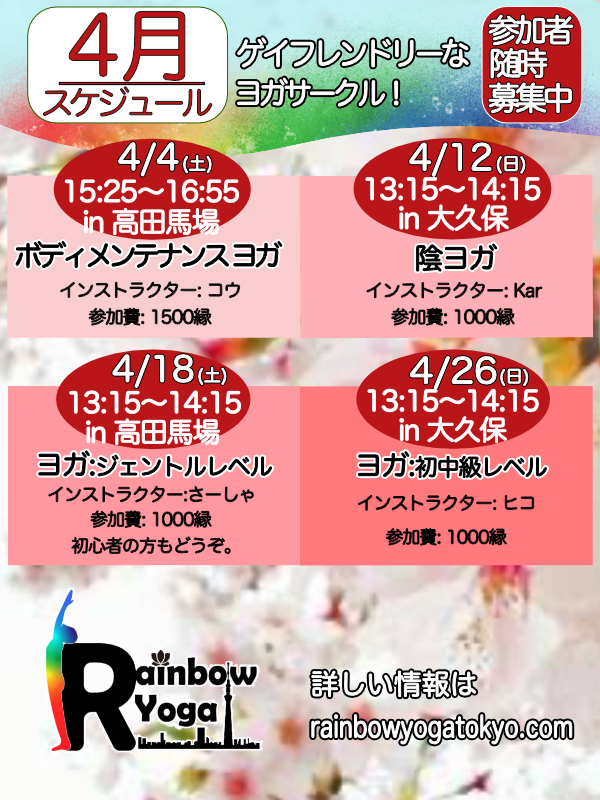 スケジュール 各月の予約開始日は、その前月の第一月曜日の夜からとなります(例:4月のレッスンの予約開始日は、3月の第一月曜日の夜位より)。 各レッスンやイベントへのお申込みは、下記のボタンをクリック。 練習場所の詳しい情報は、予約完了後、お送りいたします。 ご予約・お問い合わせ 共有: X で共有 (新しいウィンドウで開きます) X Facebook で共有 (新しいウィンドウで開きます) Facebook いいね 読み込み中…